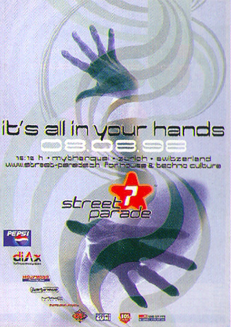 Die Street Parade wurde auf den 8. August festgesetzt. Drei Monate vor dem Event erhält die Street Parade den Sonderpreis des ADC Art Directors Club Schweiz, einen Goldwürfel. Der «Verein street parade authorities» wird in «Verein Street Parade Zürich» umbenannt. Rund 450'000 Besucher tanzten im Takt der 30 Love Mobiles unter dem Motto «Its all in your hands».