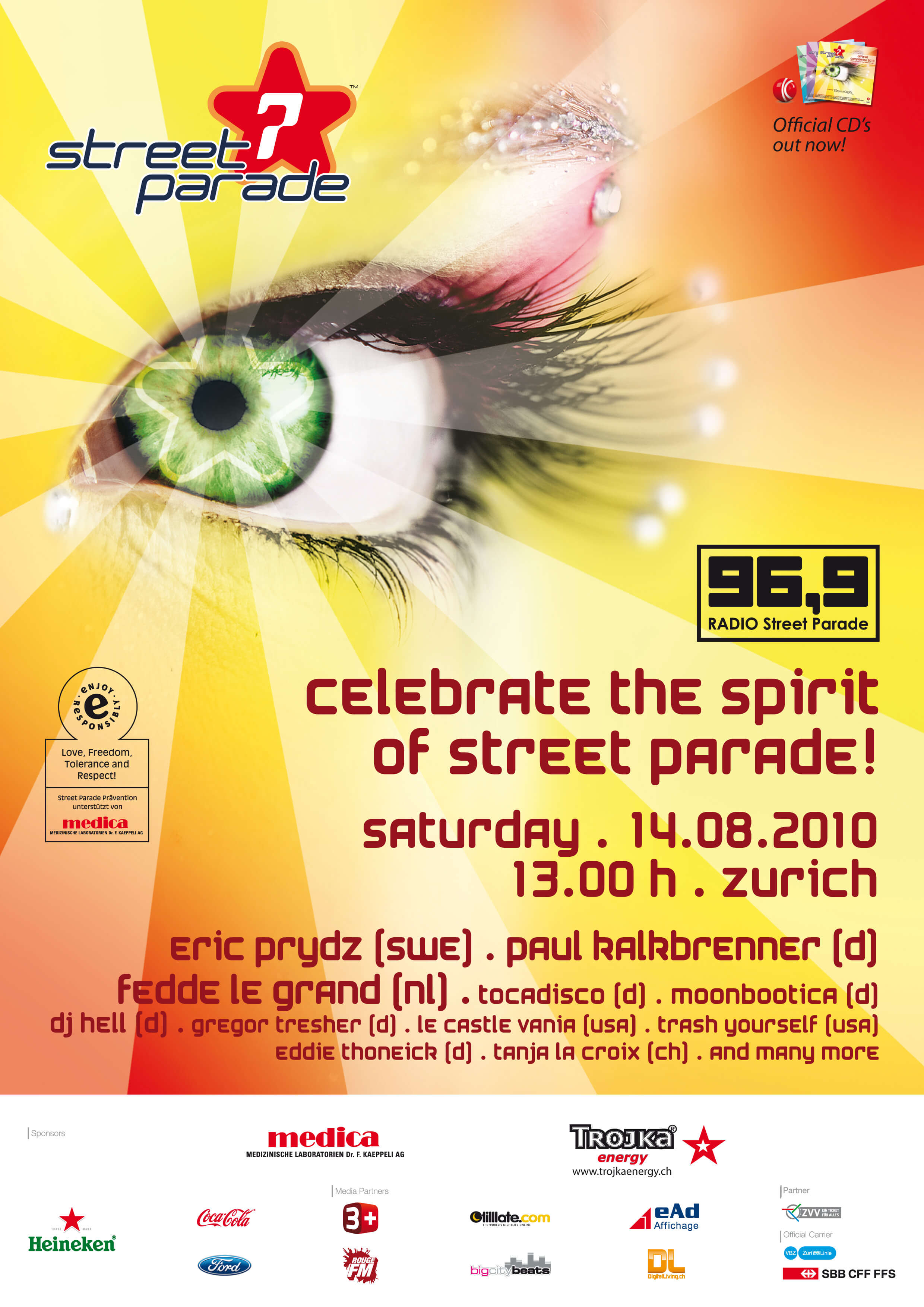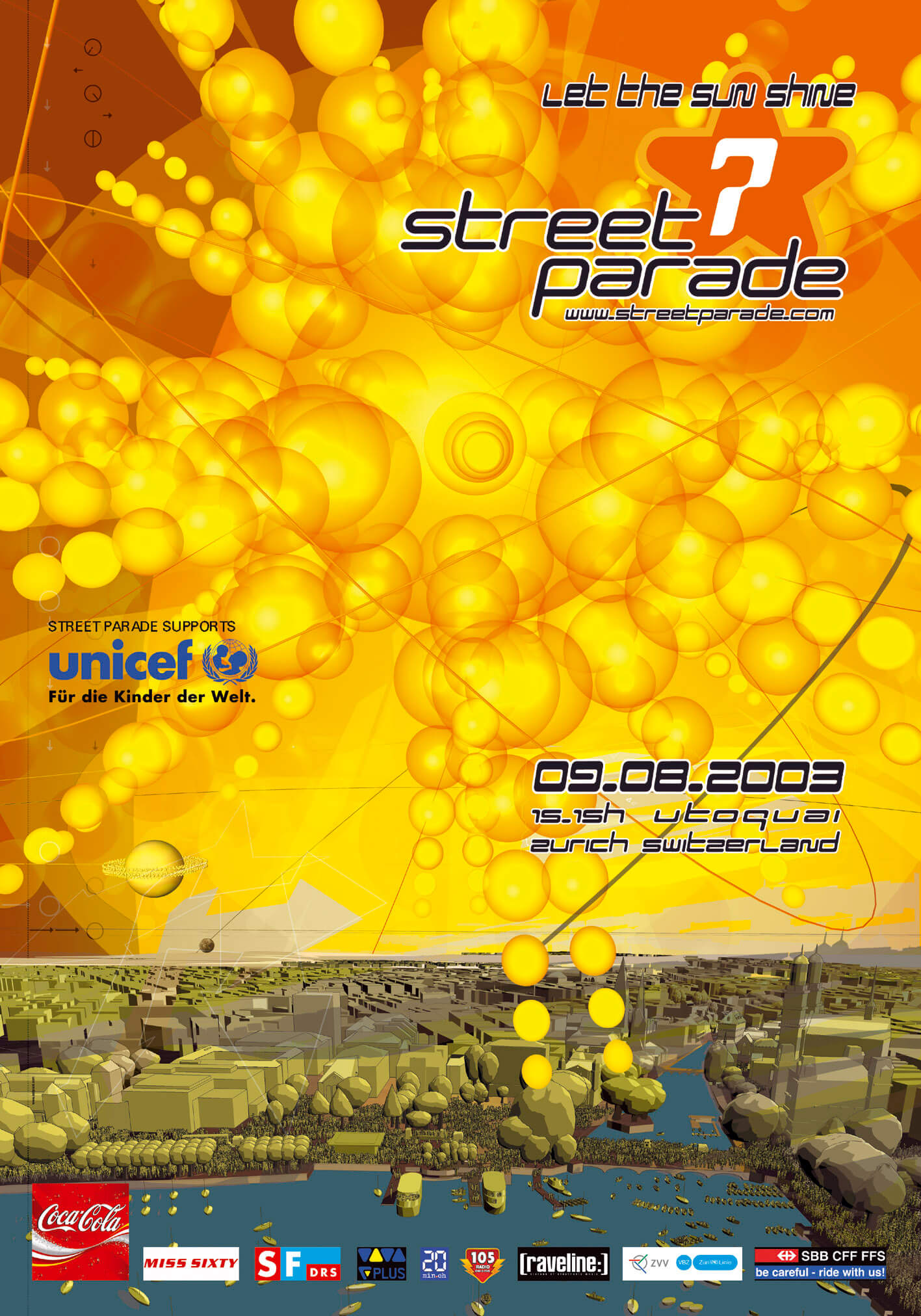 Pünktlich zur Street Parade feiert die Sonne ihr «Coming-Out». Am Tag vor und nach der Street Parade jedoch regnet es in Strömen. Weltelite-DJs geben sich in Zürich die Klinke in die Hand. Die Top 5 im DJ-Ranking lassen an der Parade ihre besten Scheiben drehen. Zudem sorgt in der Nacht eine gigantische Lasershow vor dem Operhaus für Furore. Radio Street Parade sendet nach mehrjähriger Verbannung vom Studio am Seebecken wieder direkt vom Zürichsee. Täglich schalten ca. 35’000 Fans ins Radioprogramm der offiziellen Ätherstimme der Street Parade.