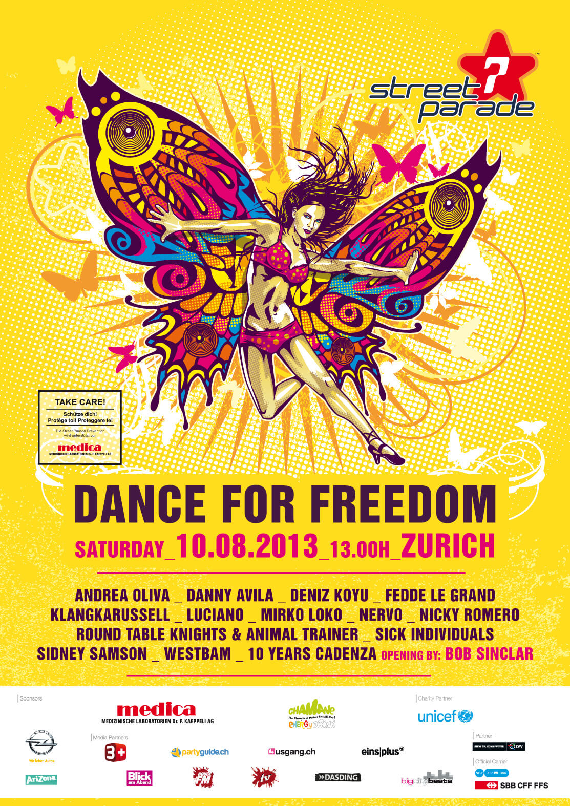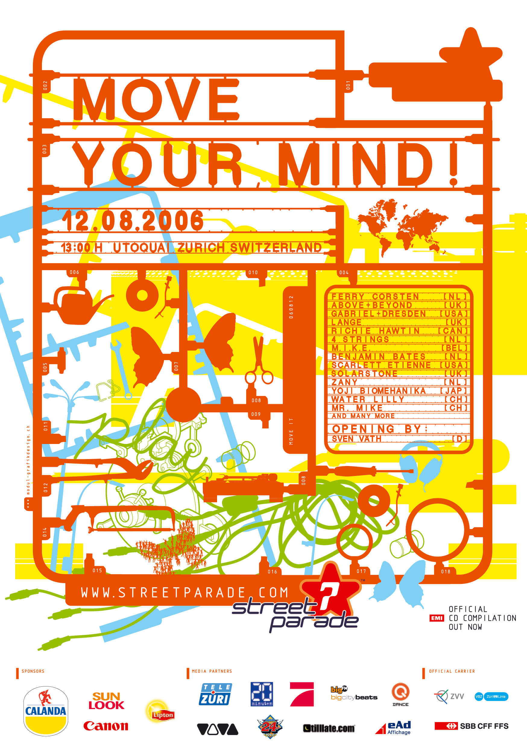 Die 21. Street Parade begeisterte 950'000 Besucher bei perfektem Sonnenschein und 25 Grad. Erstmals war ein chinesisches Love Mobile dabei, und Ferry Corsten führte die Parade an. Unter dem Motto «Berlin meets Zurich» brachten Berliner DJs wie Anja Schneider die Szene nach Zürich. Parallel zeigte das Museum Rietberg mit über 300 indischen Skulpturen Parallelen zur Street Parade.