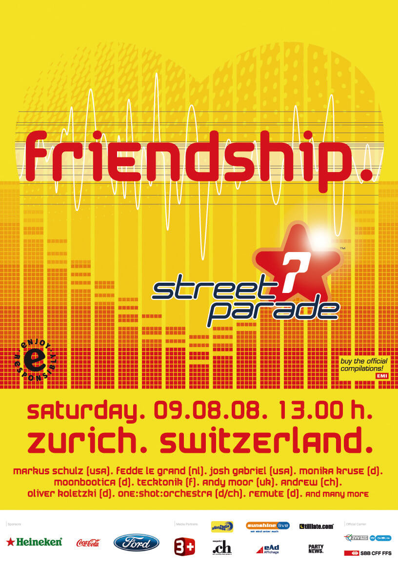 Bei sonnigen 24 Grad feierten rund 820'000 Menschen die Street Parade unter dem Motto «FRIENDSHIP!», das zu einem friedlichen und achtsamen Miteinander aufrief – und auch gelebt wurde. Erstmals traten neben Top-DJs auch Live-Bands auf. Der Zürcher Stadtrat stärkte der Parade den Rücken: Polizeivorsteherin Esther Maurer bezeichnete sie als Kulturgut, vergleichbar mit dem Dadaismus.