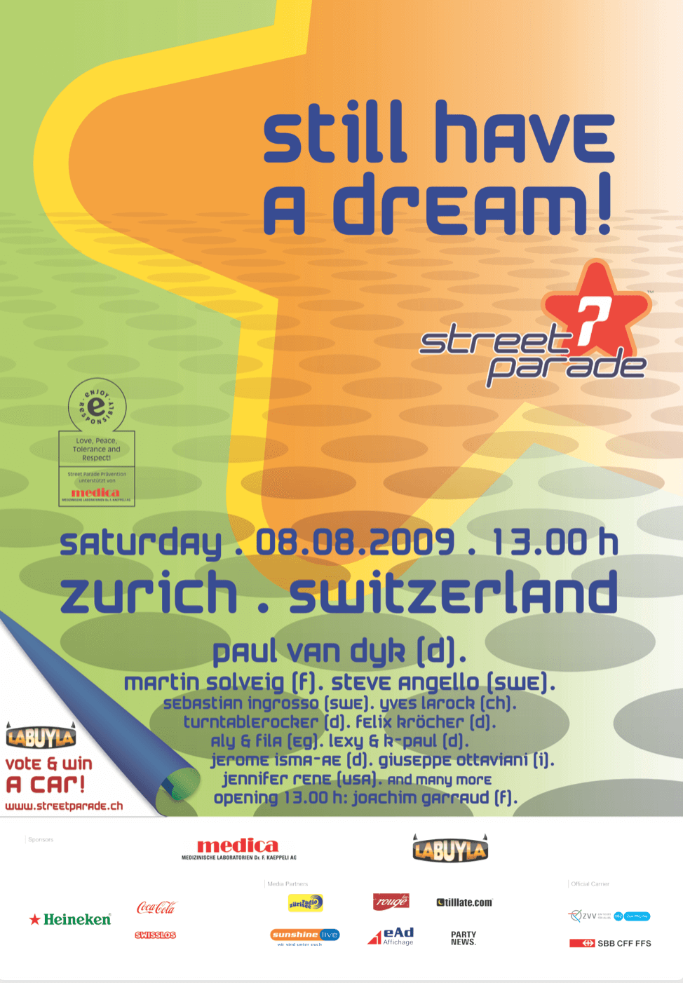 Zur 18. Street Parade trotzten rund 600'000 Fans Regen, Kälte und den Warnungen vor der Schweinegrippe – die blieb am Ende zum Glück aus. Unter dem Motto «Still have a dream» wurde an die Kraft von Träumen erinnert. Wegen des Wetters gab es vermehrt Unterkühlungen, Paul van Dyk sagte kurzfristig ab. Neue Bühnen kompensierten Baustellen, das Line-up bot internationale und lokale Top-DJs.