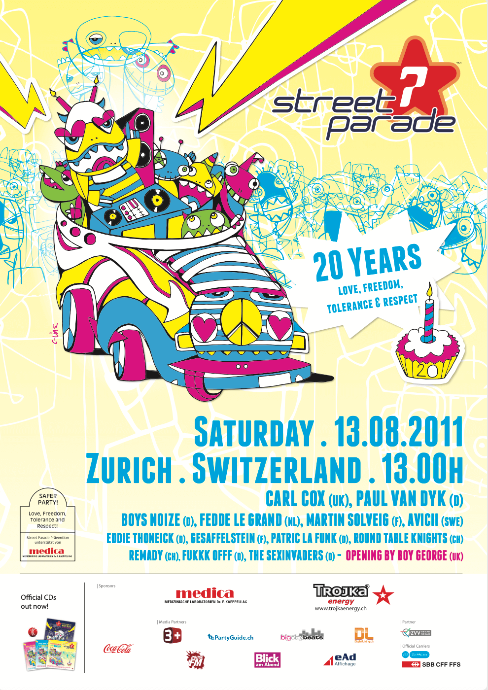 Zum 20-jährigen-Jubiläum stand die Jugend im Fokus – mit gezielter Förderung junger DJs und Produzenten. Highlights: das liebevoll nachgebaute Retro-Mobile, die Jubilee-Stage mit langjährigen Acts und ein generationsübergreifendes Line-up von Carl Cox bis Avicii. Um 19 Uhr sorgte eine Gedenkminute mit John Lennons «Give peace a chance» für Gänsehaut. Bei bestem Wetter tanzten Hunderttausende bis zur großen Lasershow zum Finale.
