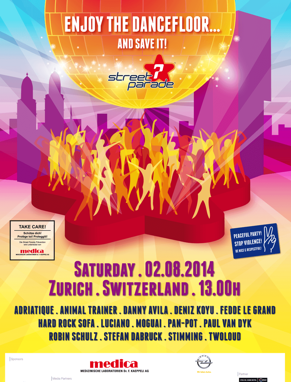 Die 23. Street Parade zog 2014 rund 950’000 Besucher an und ging als friedliches und ausgelassenes Fest in die Geschichte ein.Wegen der Leichtathletik-EM fand sie ausnahmsweise schon am 2. August statt. 27 Love Mobiles rollten rund ums Zürcher Seebecken.Trotz düsterer Prognosen klarte das Wetter pünktlich zum Start auf – erst am Abend zog ein leichtes Gewitter auf. Eröffnet wurde die Parade vom BigCityBeats-Love Mobile mit Star-DJ ATB. Auf den Stages sorgten Robin Schulz, Paul van Dyk und Luciano für Stimmung. Danny Avila und Deniz Koyu setzten beim Mainstage-Closing am Bellevue das Highlight.