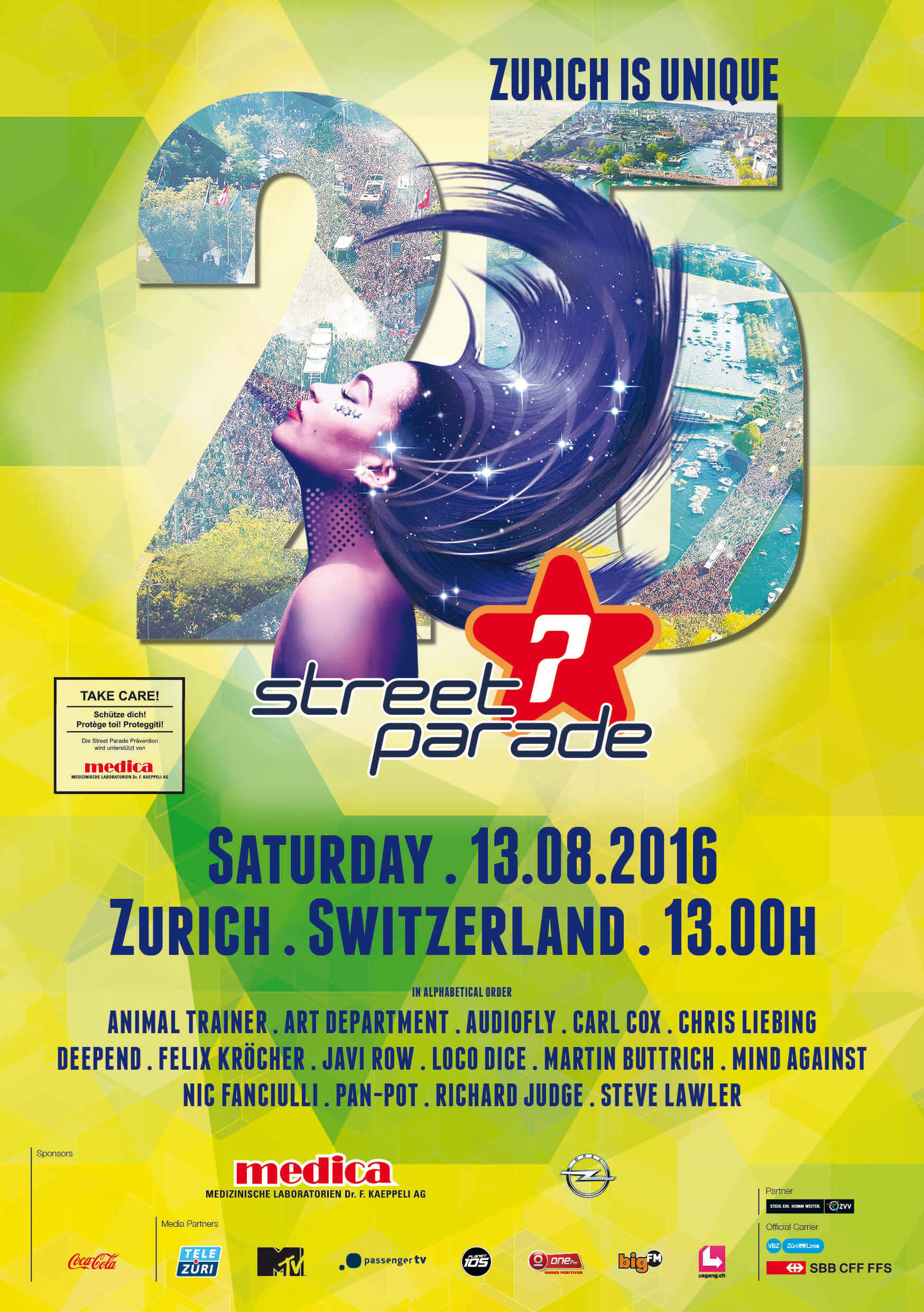 Bei Sonnenschein und 27 Grad feierten rund 900'000 Menschen die 25. Street Parade unter dem Motto «Unique».Zum Jubiläum wurde am Hechtplatz ein stehendes Love Mobile von 1992 zur Bühne – mit Deko aus der Anfangszeit und Sets von den Original-DJs sowie Dr. Motte.Wegen politischer Unruhen wurde das Sicherheitskonzept verschärft, die Polizei war stark präsent – und posierte gern für Selfies.Carl Cox sorgte mit einem spektakulären Closing am Opernhaus für Gänsehaut. Erstmals beteiligten sich auch die Clubs Hive («Rakete-Party») und Bellevue («Daydance»).