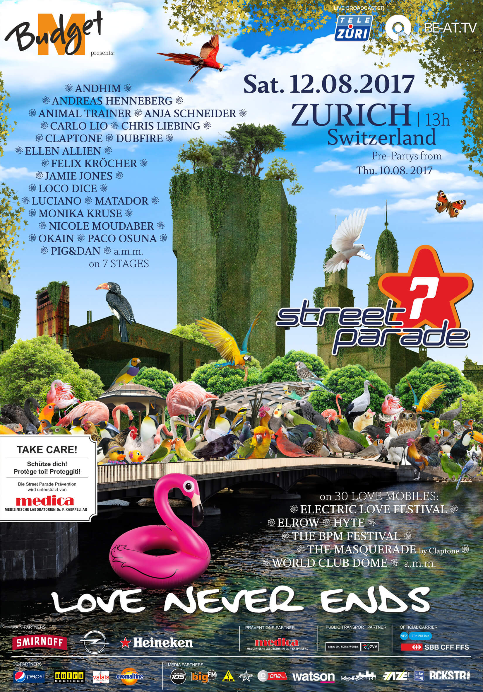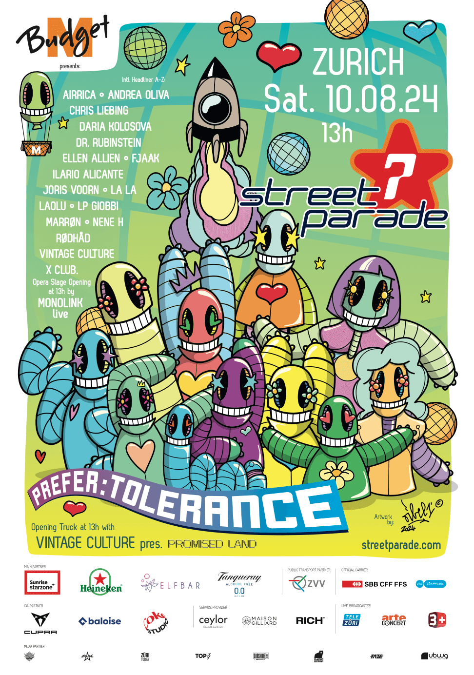 Geschätzte 920'000 Besucher:innen fanden den Weg in die Zürcher Innenstadt und tanzten im Takt der 26 Love Mobiles. Aufgrund des sonnigen und heissen Wetters haben am Nachmittag viele Leute Schatten in den «Häuserschluchten» gesucht. Das Festgelände war dennoch früh gefüllt, was sicher auch dem hochkarätigen Line-up zuzurechnen ist: Das Motto «Prefer:Tolerance» rief zu mehr Toleranz in der Gesellschaft auf.