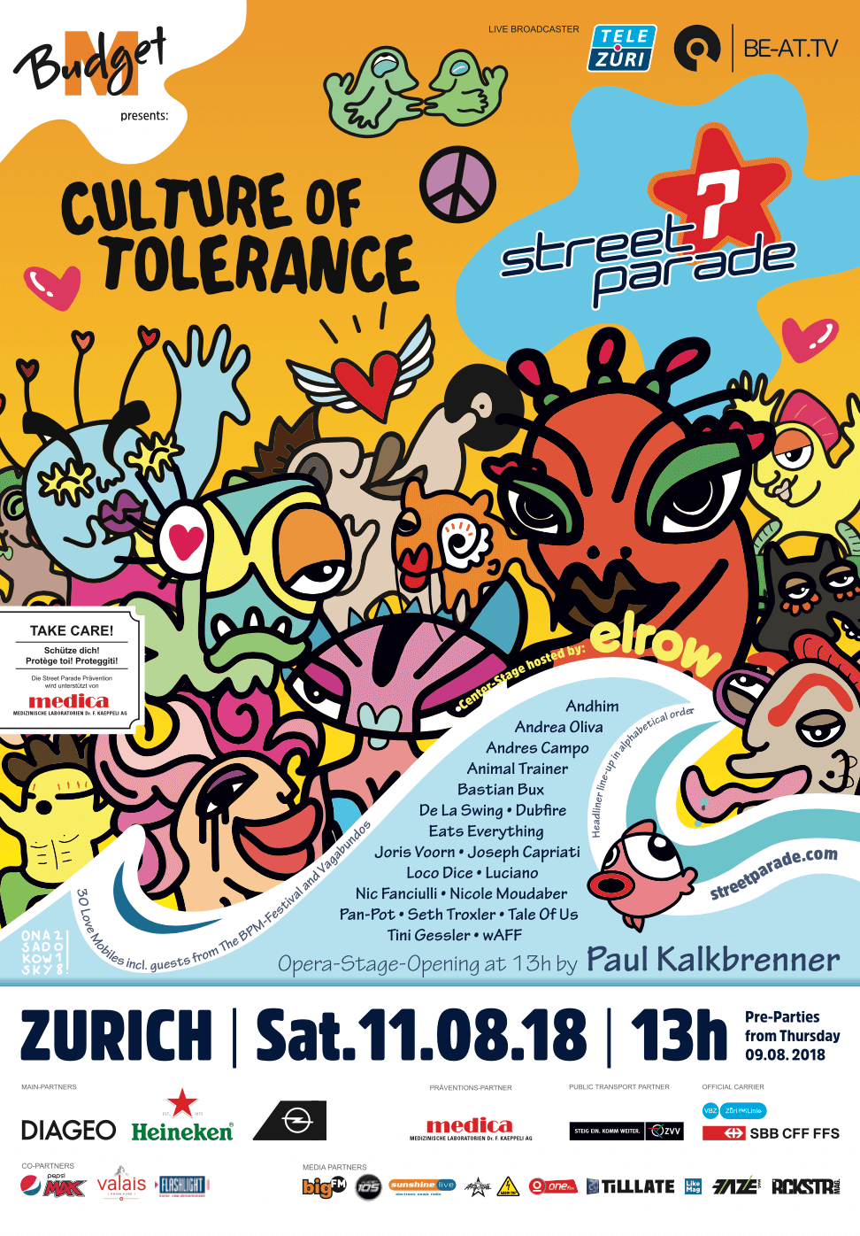 Techno steht für Toleranz – unter dem Motto «Culture of tolerance» betonte die Street Parade 2018 diese Botschaft. Paul Kalbrenner eröffnete mit einem zweistündigen Set den vollen Sechseläuten-Platz. Zum ersten Mal gab es ein Bühnenfeuerwerk zum DJ-Set von Pan-Pot als Finale. Das spanische Label Elrow verwandelte den Bürkliplatz mit Shows und DJs in ein buntes Spektakel. Zürcher Clubs kehrten mit eigenen Love Mobiles zurück, unterstützt von der Kommunikationsplattform @night.