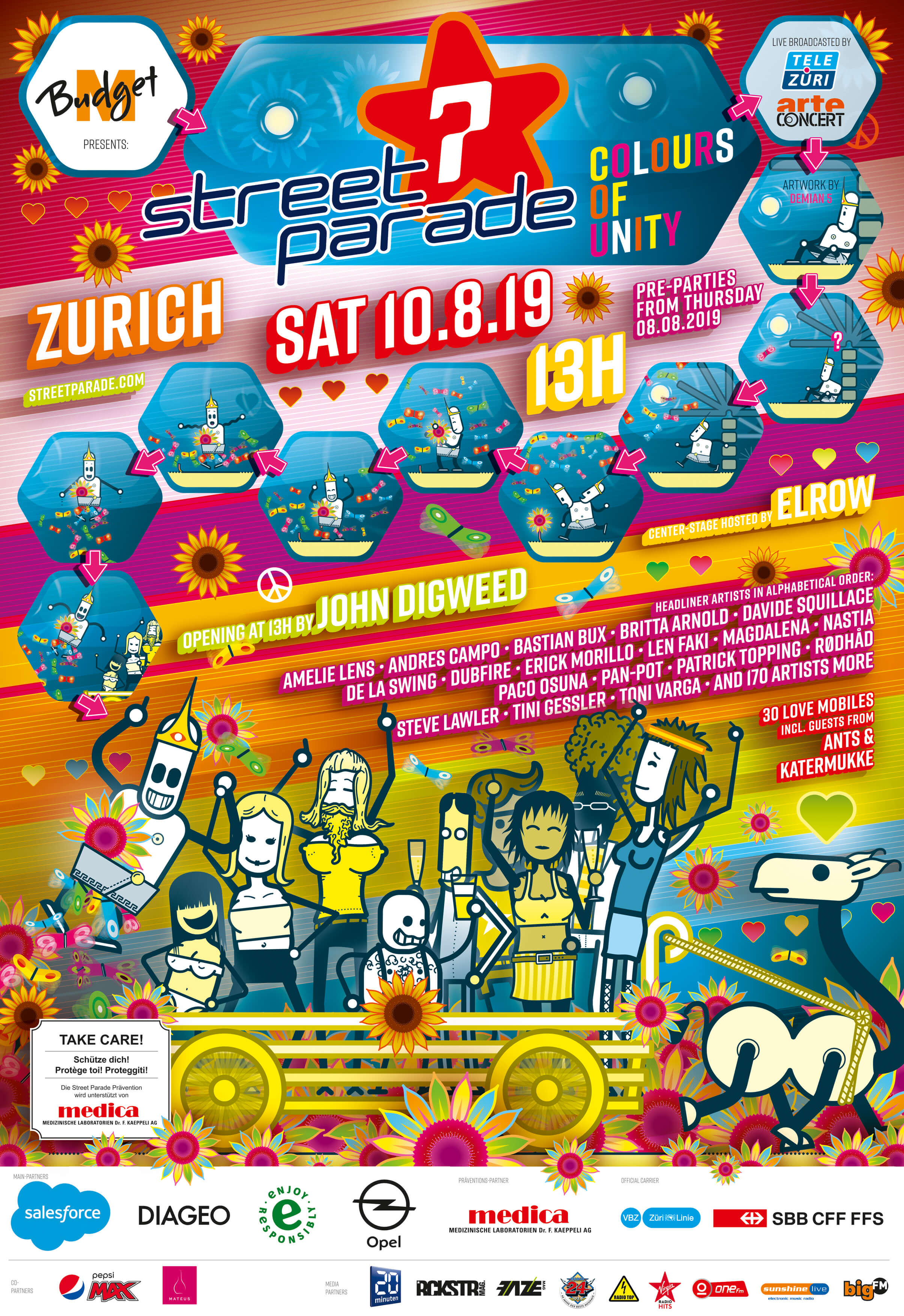 Starkregen machte den Aufbau schwierig, doch pünktlich zum Warm-up klarte es auf, und rund 850'000 Besucher tanzten bei 24 Grad. Unter dem Motto «Colours Of Unity» standen Vielfalt und Zusammenhalt im Fokus. Das Artwork stammte vom Zürcher Künstler Demian5. Internationale Labels wie Elrow, Ants und Katermukke waren mit Love Mobiles dabei. Erstmals übertrug ARTE Concert die Parade live, Amelie Lens' Closing erreichte über 1,7 Mio. Views auf Youtube.
