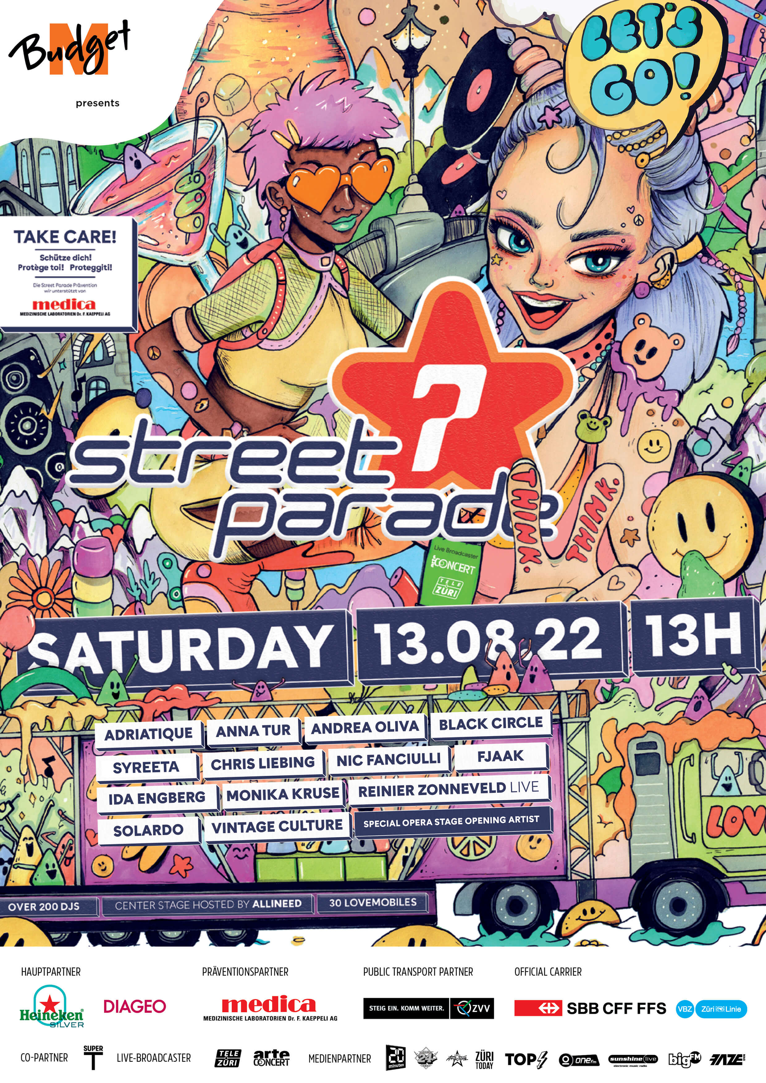 Nach zwei Jahren Pandemiepause kehrte die Street Parade zurück – trotz spät erteilter Bewilligung und Personalmangels. Mit viel Einsatz und neuen Kräften gelang die Organisation der 29. Ausgabe. Wie viele Menschen kommen würden, war unklar, doch schliesslich tanzten 900 000 ausgelassen und friedlich. Bereits vor dem ersten Beat war die Route gut gefüllt. Unter dem Motto «THINK.» rief die Parade zum Nachdenken auf, unterstützt vom Plakat der Zürcher Künstlerin Feggy Min.